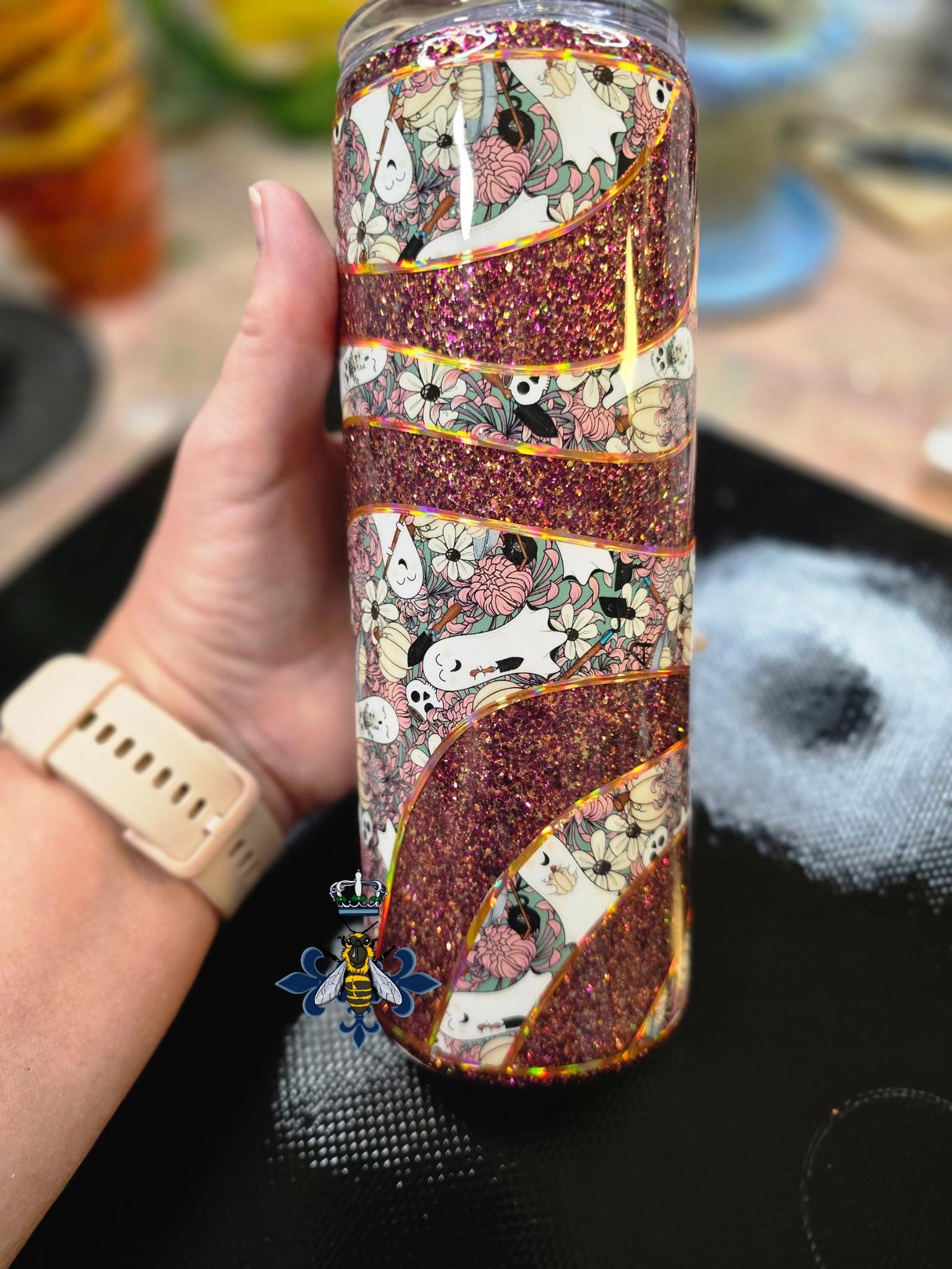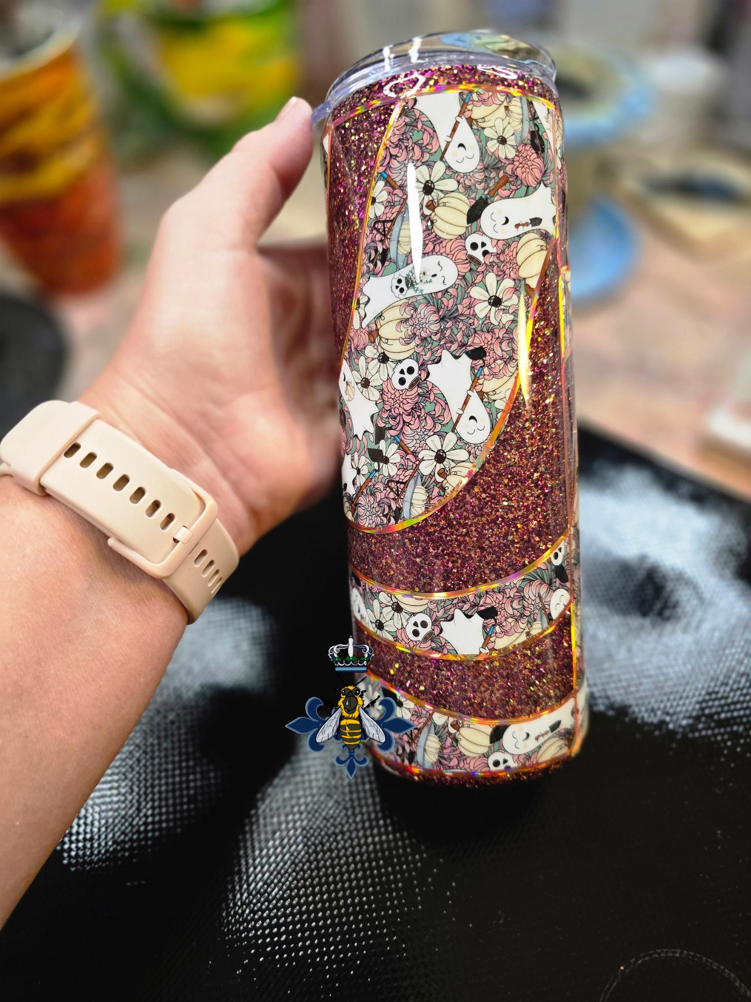 This Tumbler is so beautiful. A cute spooky halloween theme, this tumbler has a swirl design with a fall glitter underneath. Handwash only and not suitable for the microwave. Do not leave in extreme heat.