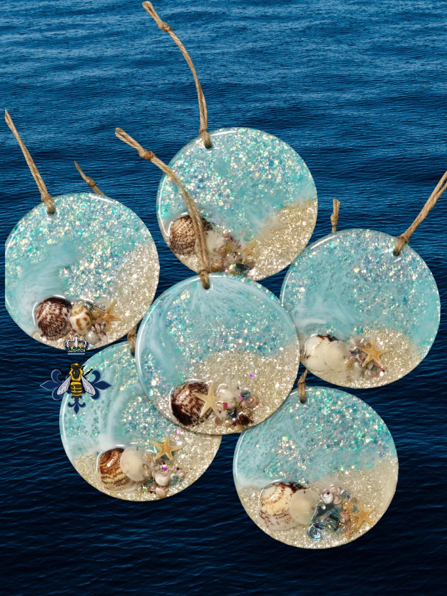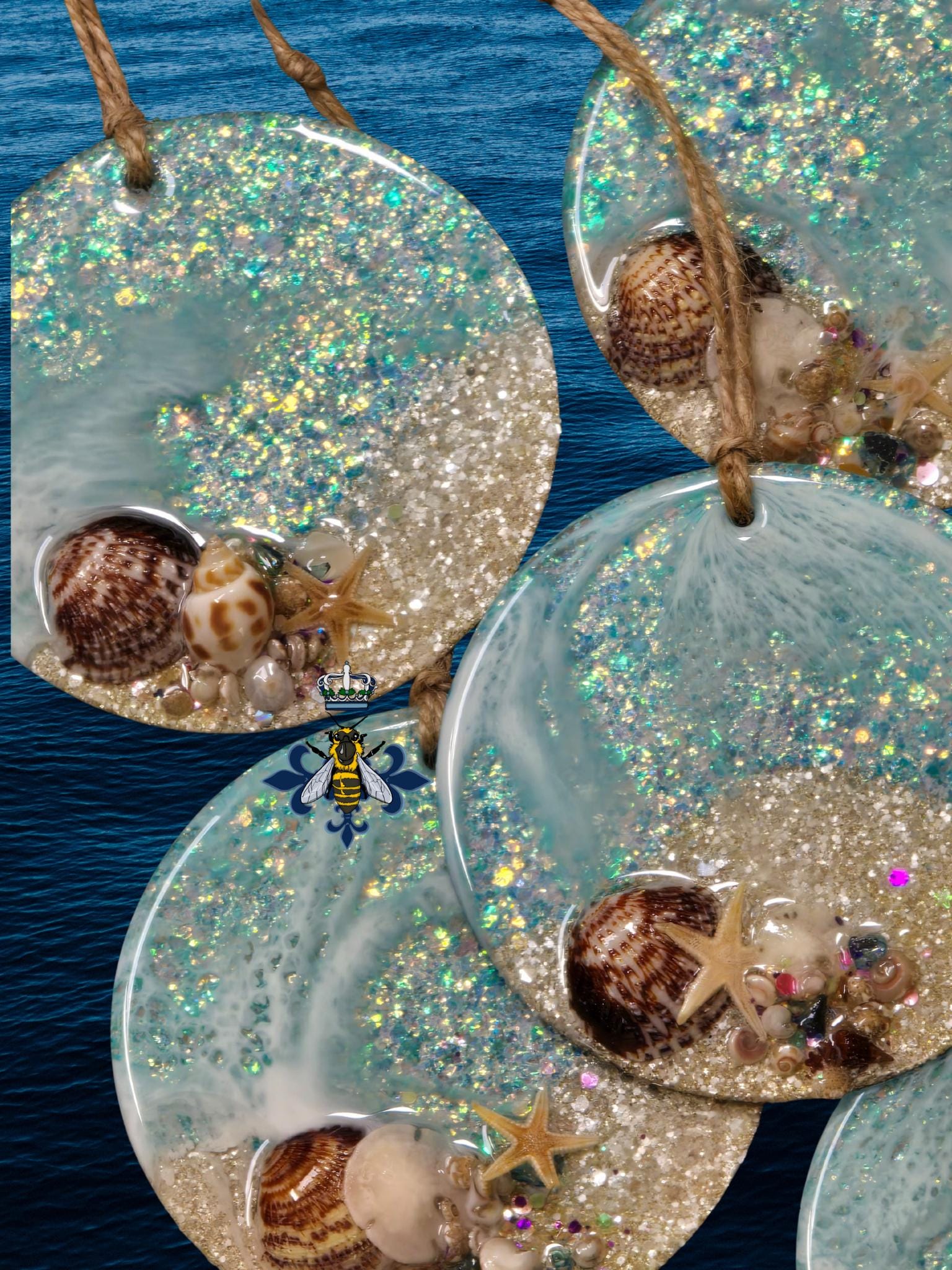 Glitter and Epoxy to make the ocean base. Then Shells are added as well. The shells are then epoxied as well.