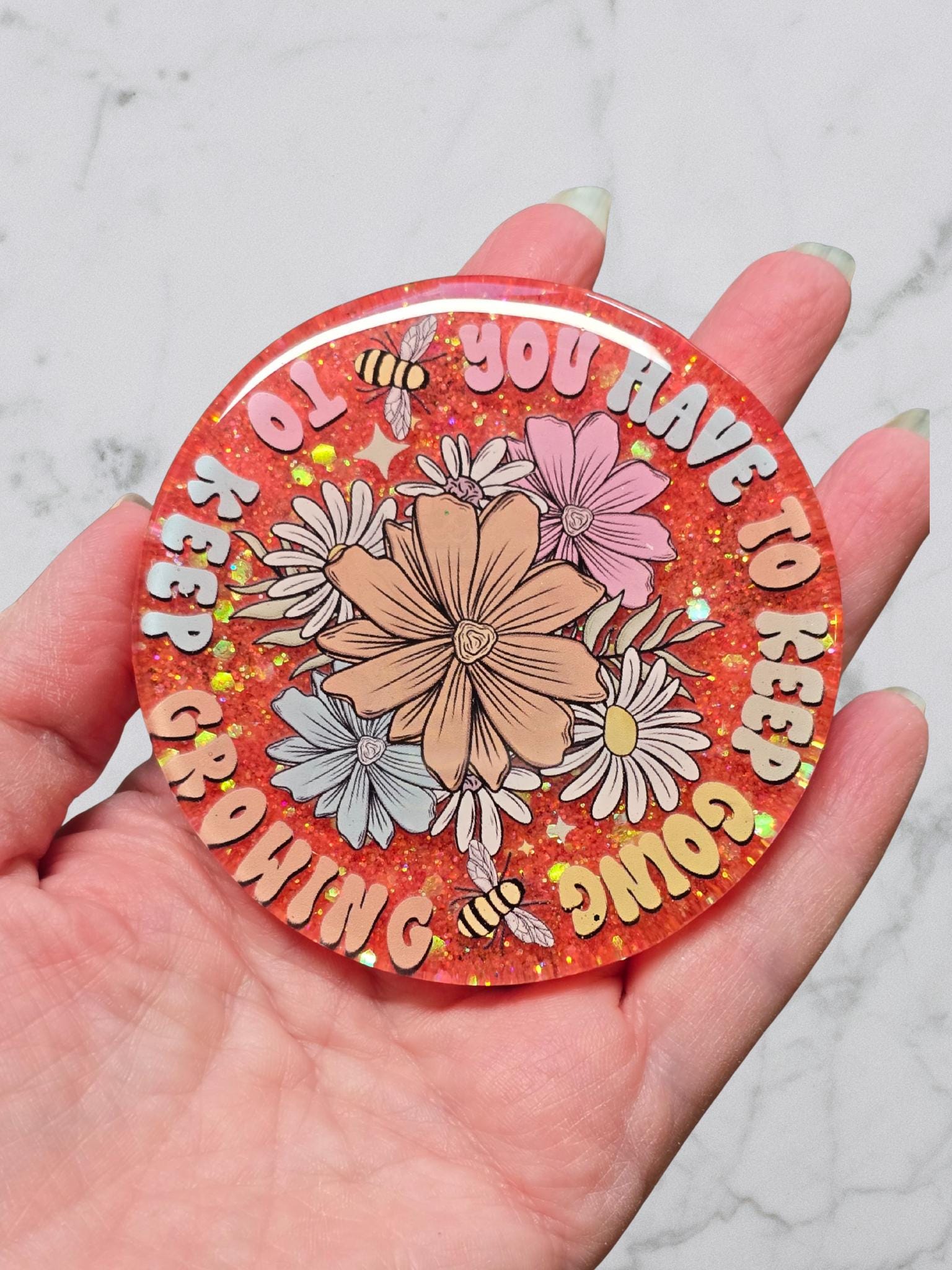 3.5 inches coaster. Gold and orange glitter. The saying is: You have to keep going to keep growing. Flowers and bees occupancy the saying. There are feet in the bottom to protect furniture.