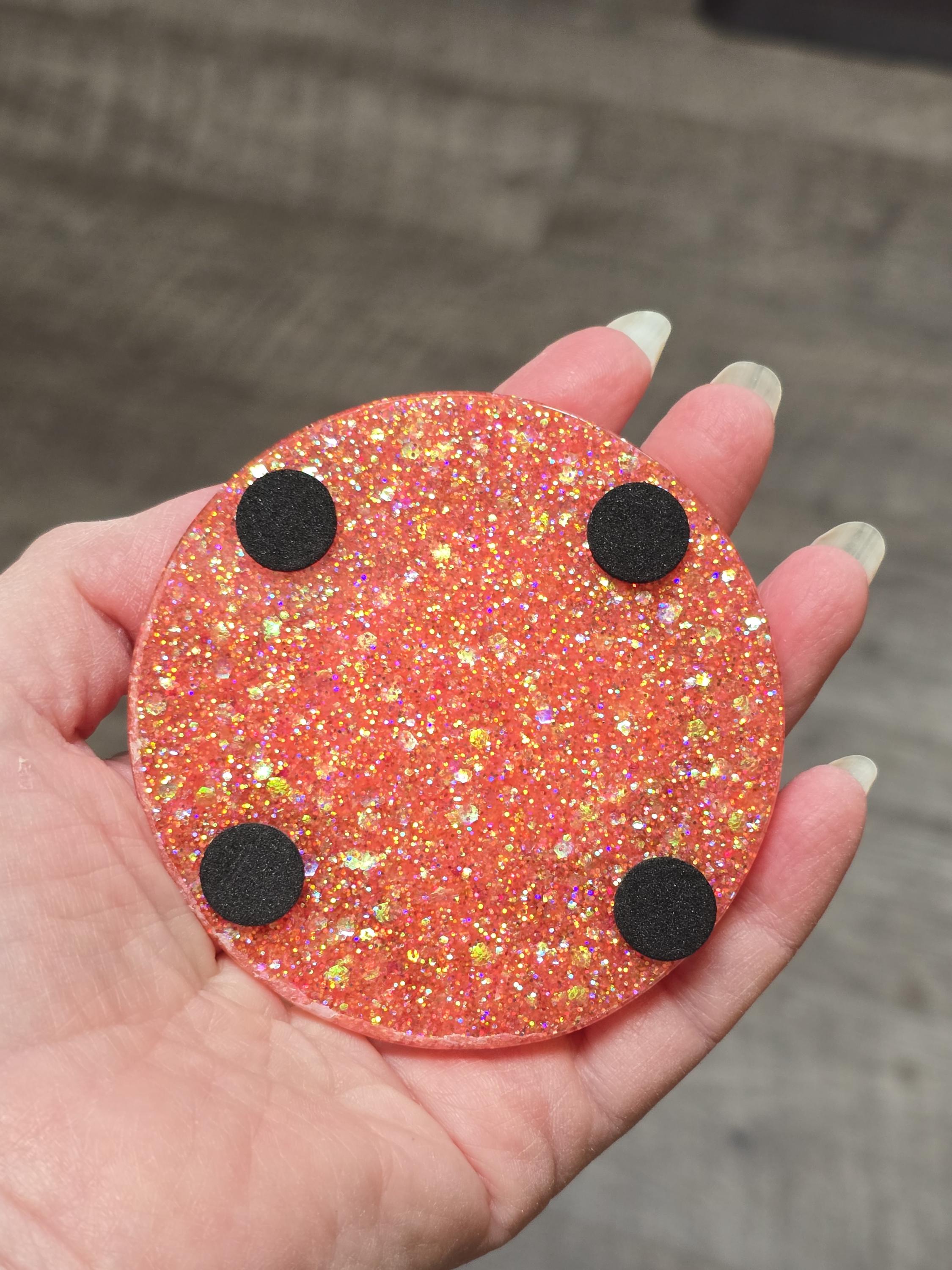 3.5 inches coaster. Gold and orange glitter. The saying is: You have to keep going to keep growing. Flowers and bees occupancy the saying. There are feet in the bottom to protect furniture.