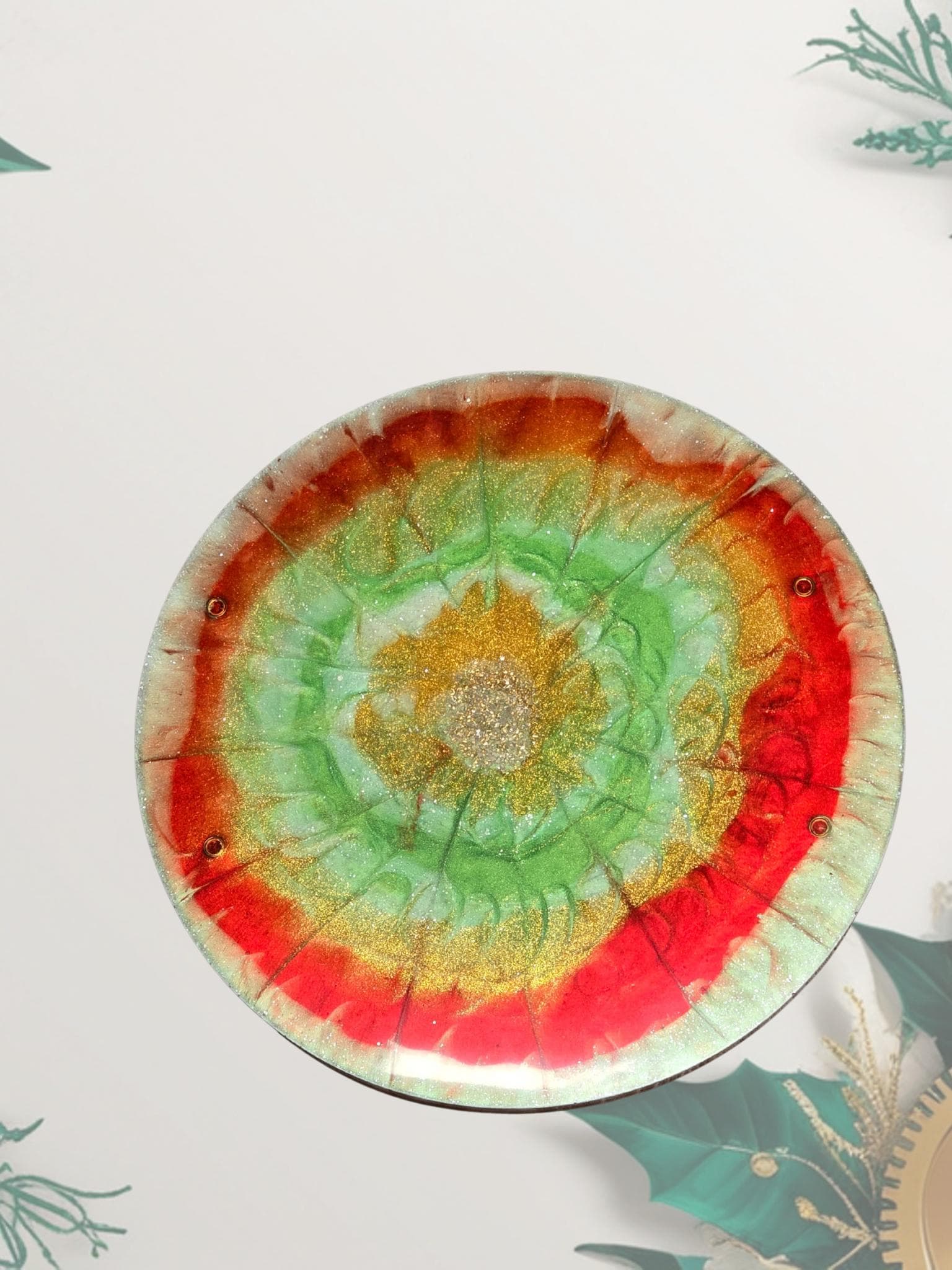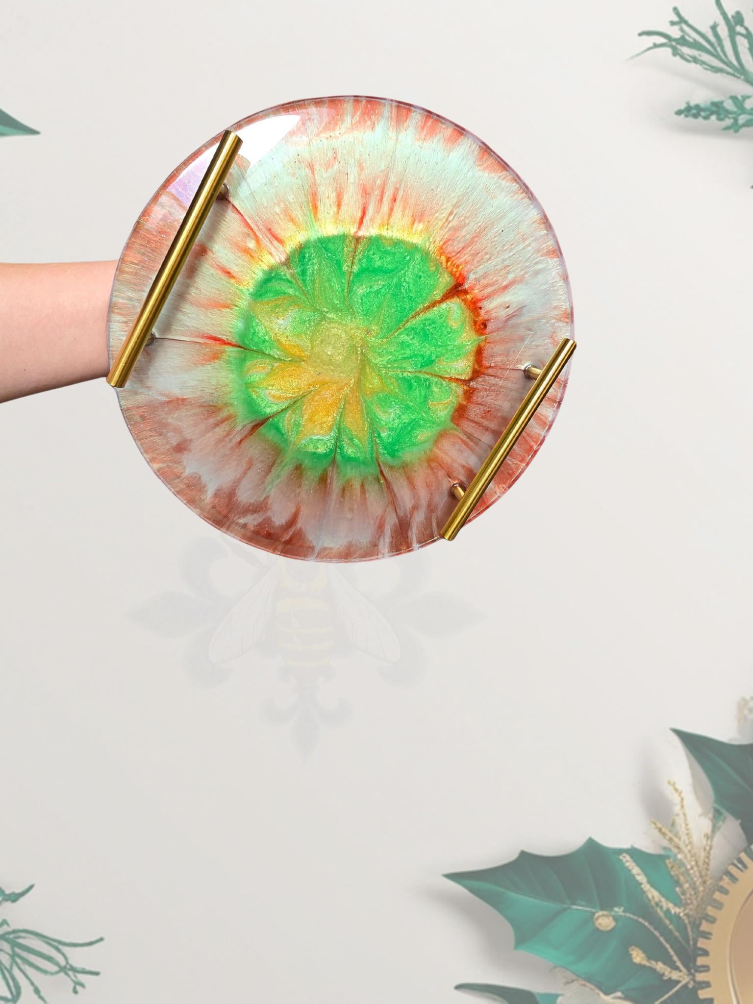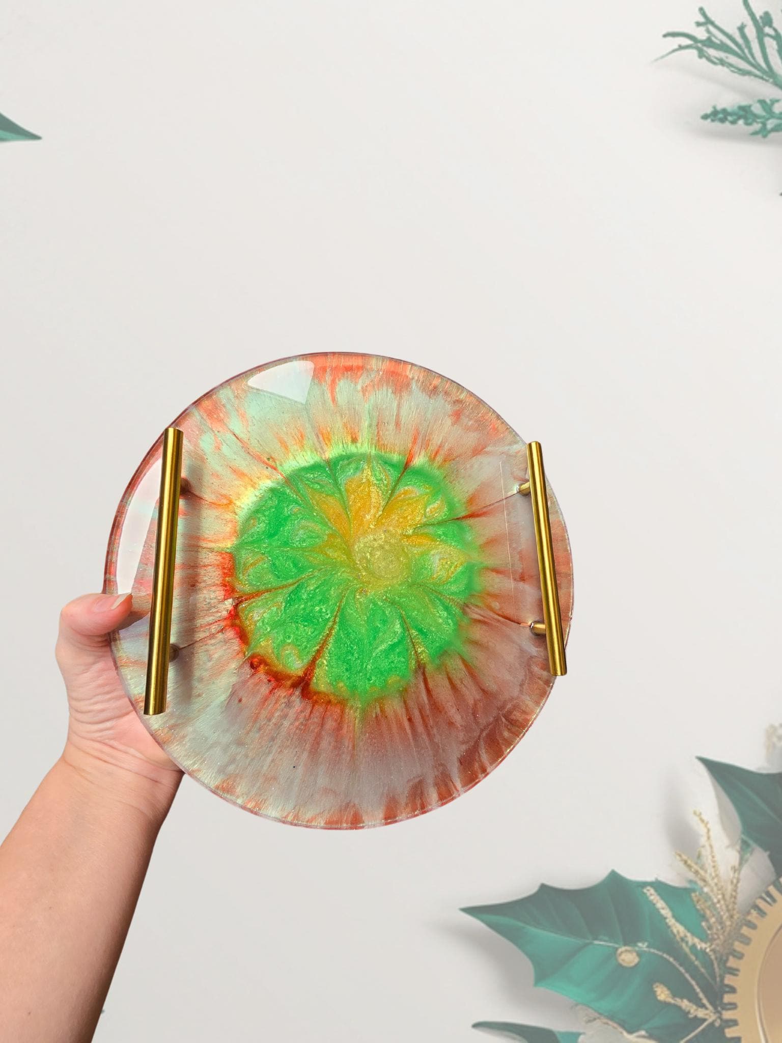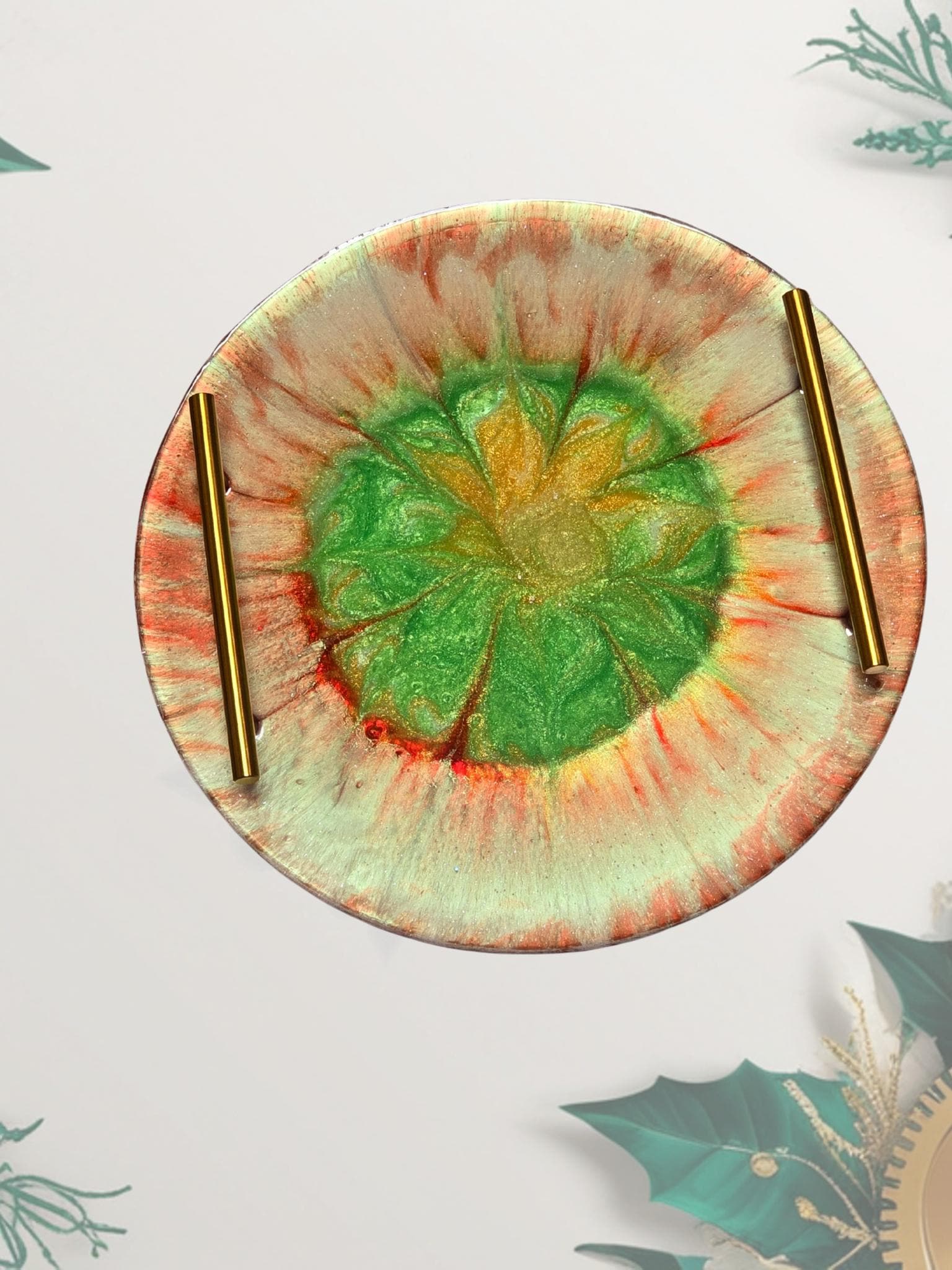 11.75 inch Round resin tray with gold colored metal handles. Christmas Theme using red, white, green and gold Mica Powders. You can use tray front or back. Handwash only. No extreme Heat. If using for food items use a dollie as a cover.