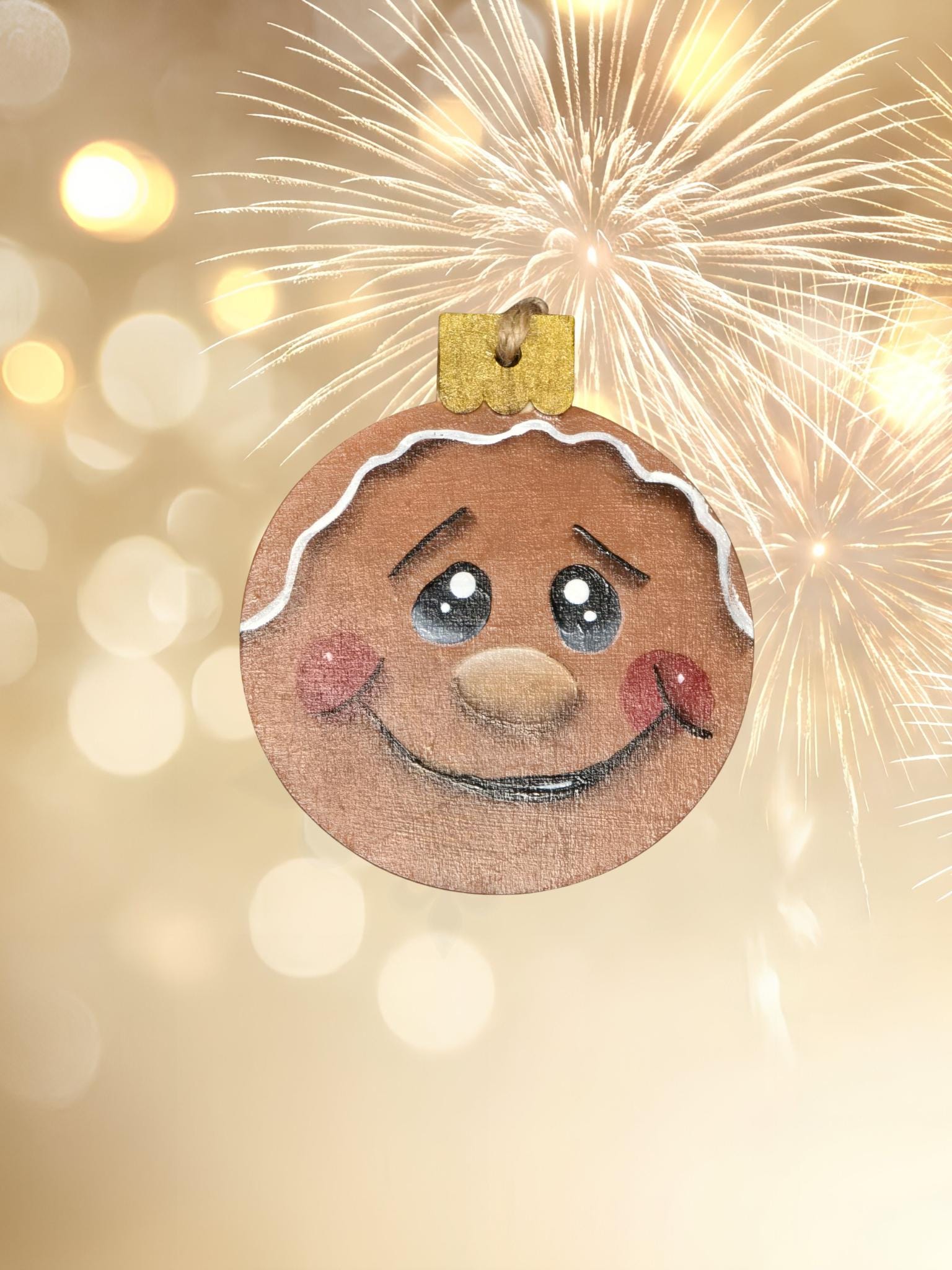 3.75 inch round wooden handpainted Christmas Ornament. Gingerbread. Sealed Signed one of a kind artwork.