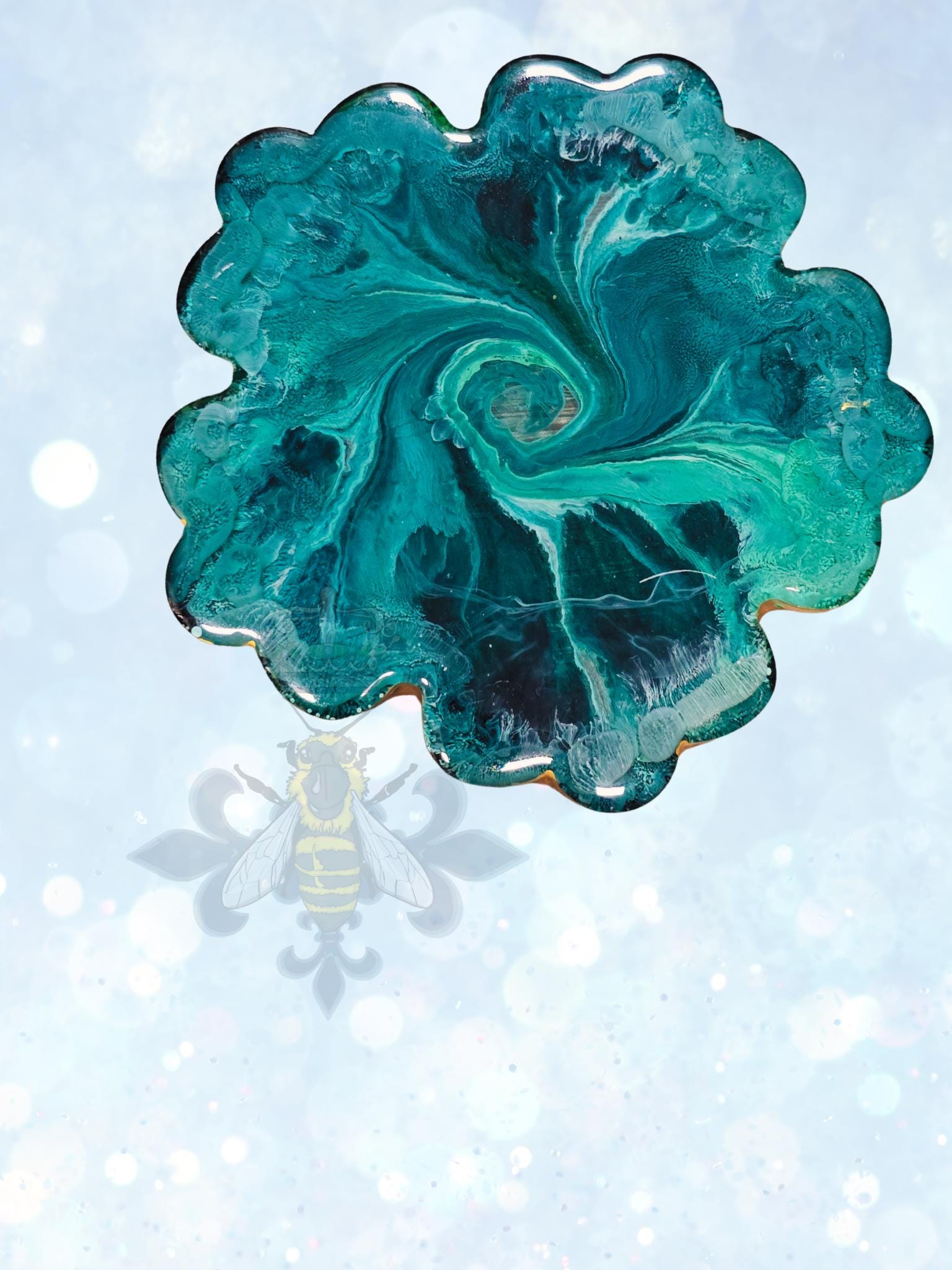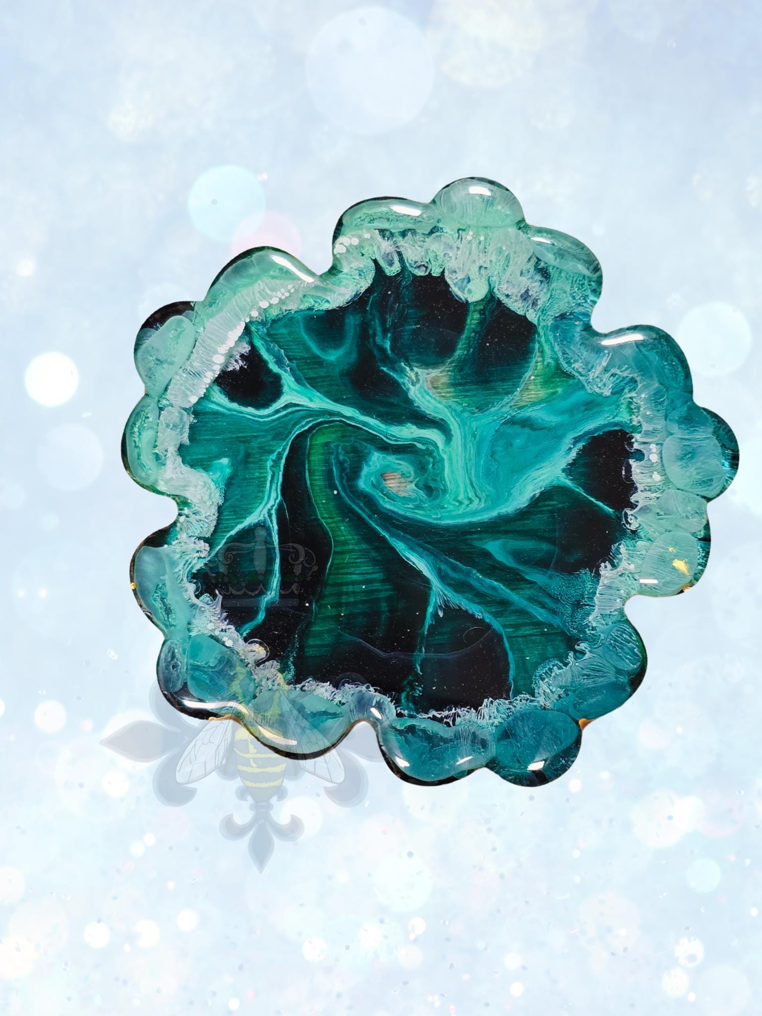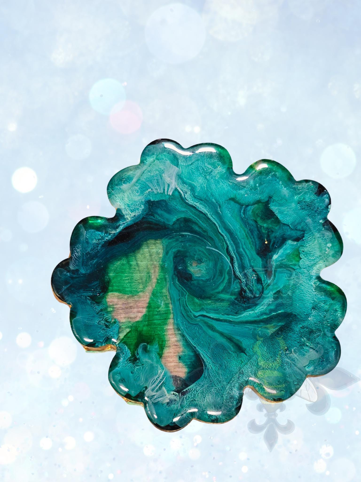 4.50 inch Flower Coasters. These Eleganr Coasters are Floral in nature. They are dark Green, Teal, White, and Clear. In a swirl pattern they have such beautiful depth and gorgeous white lacing. Each one is an original piece of art. They also have a gorgeous gold border. There are bumpers on the bottom to prevent the table from getting scratched. Handwash with a soft cloth and mild detergent.
