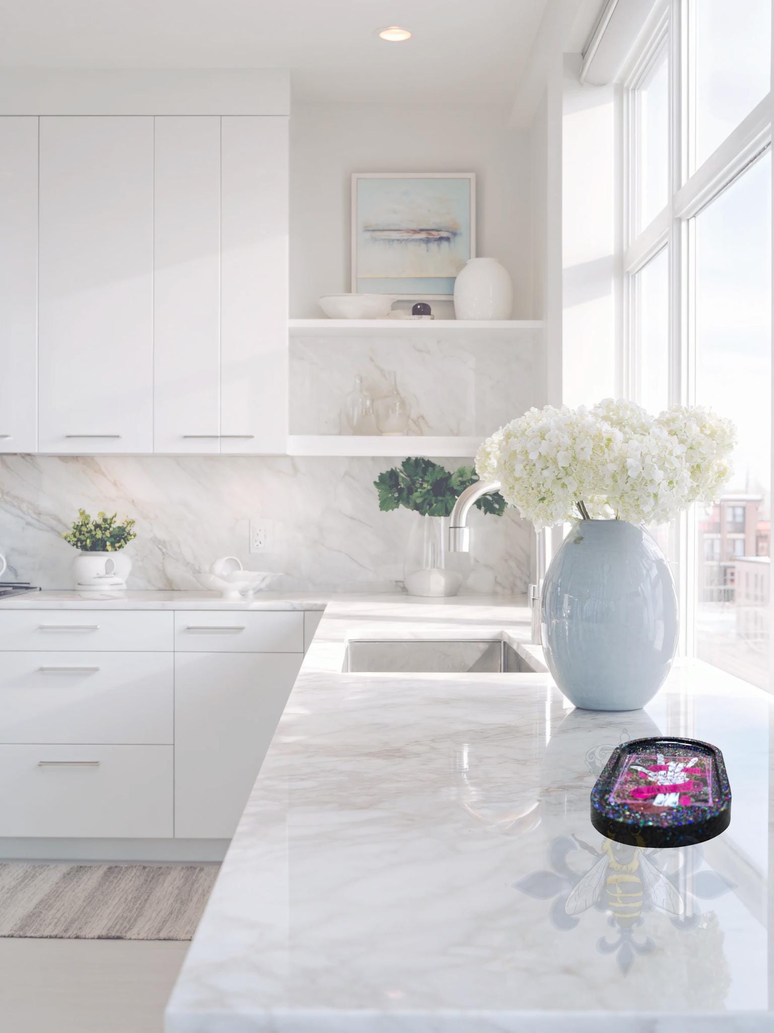 7 x 3.75 Trinket Tray, black glitter base. This beautiful Skellie Tray has a cool decal with Good Energy Skellie Decal. Handwash Only with a soft Cloth and mild soap. There are bumbers on the bottom to protect your countertop or furniture. Clean with a soft cloth and mild soap.