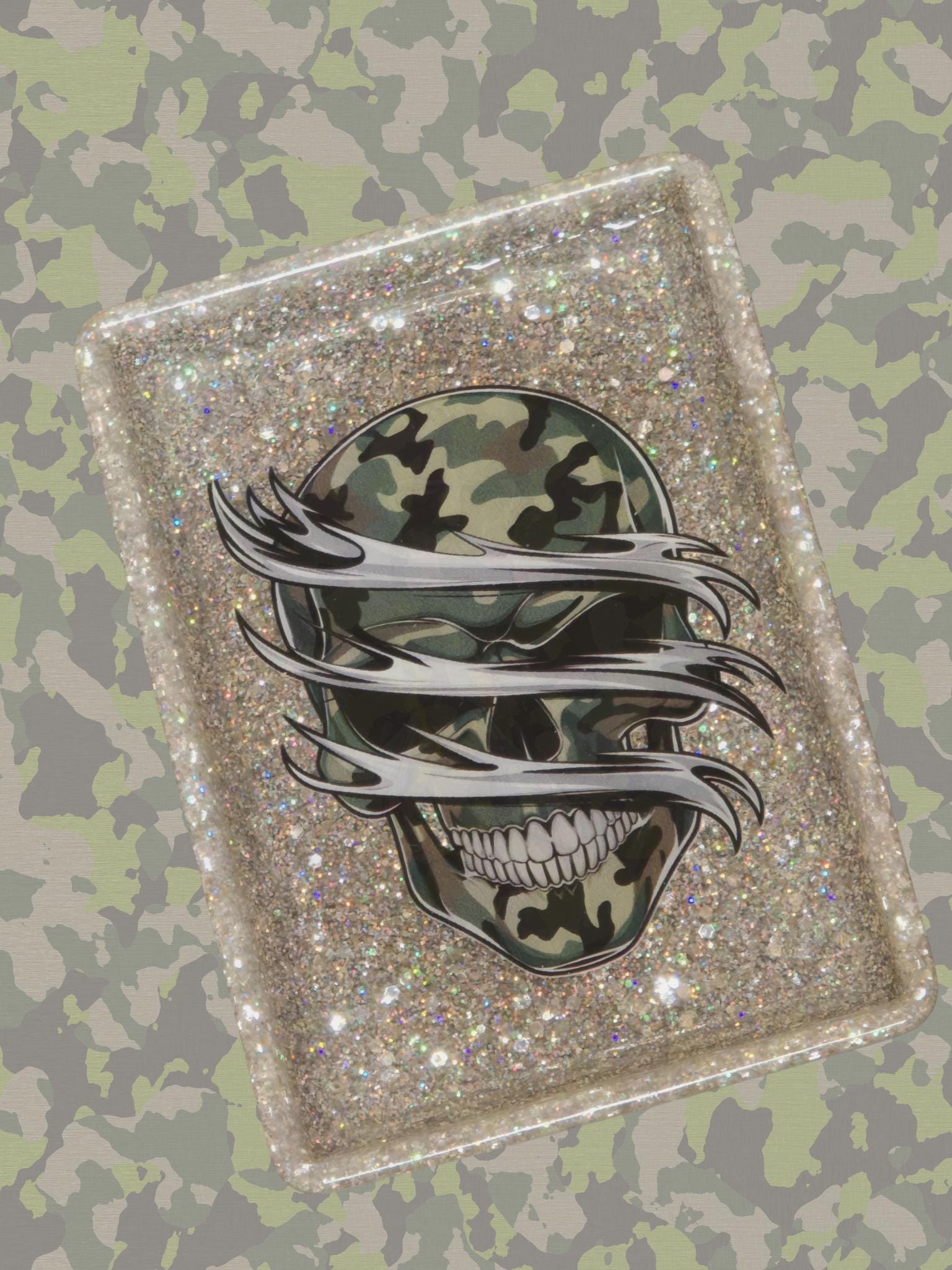 This cute tray is reminiscent of the old ticket trays they used in restaurants. The glitter is Silver Holographic. It matches the decal perfectly. This is perfect for a man. Great for his keys and change! Handwash only with a soft cloth and mild detergent.