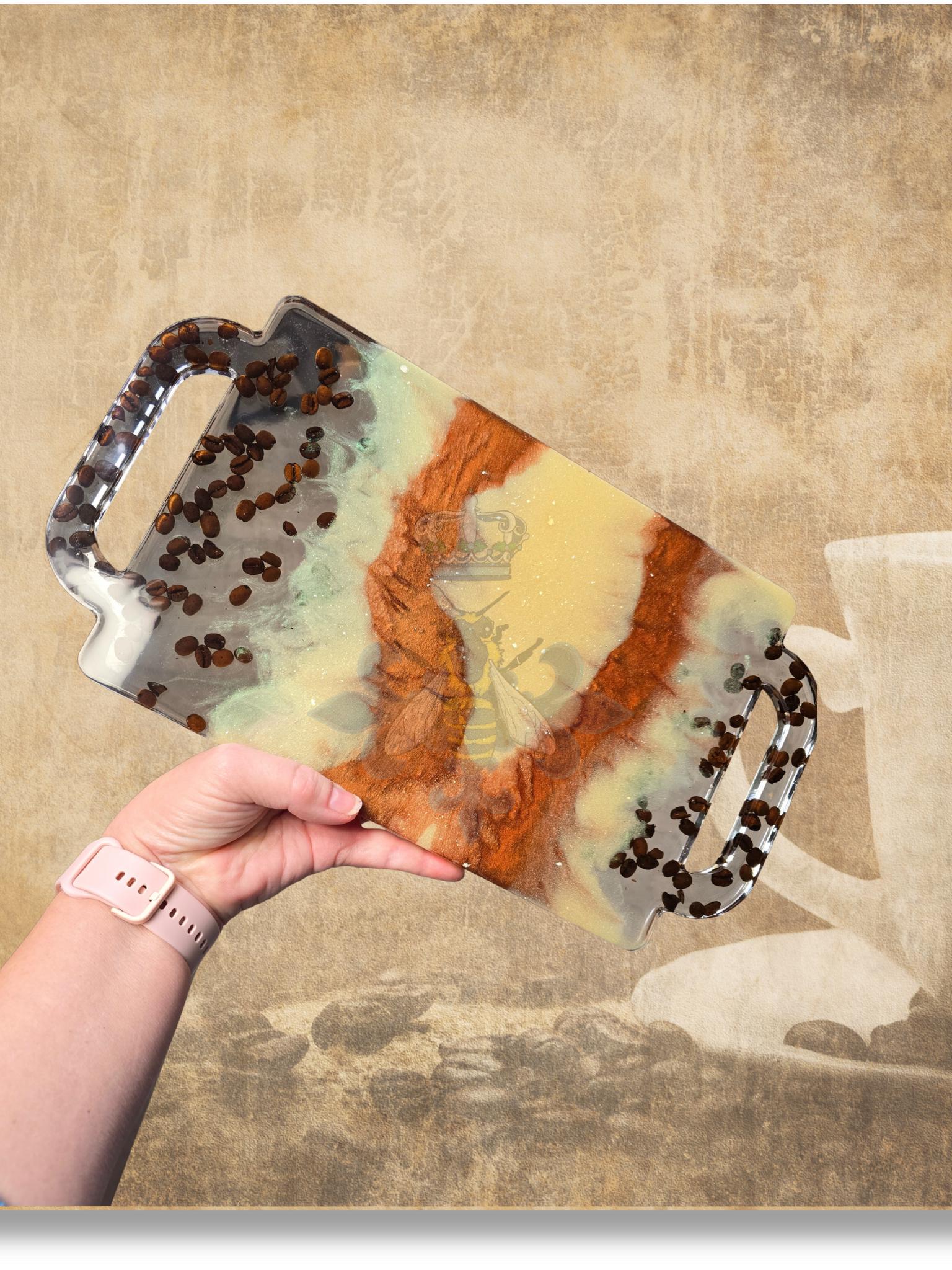 14.75 x 8 x .50 inch Coffee tray. Real Coffee Beans are suspended in this one of a kind Coffee Tray. Micas were added to show the richness of Coffee and cream. Handwash with a mild cloth anda mild detergent Shipping is free.