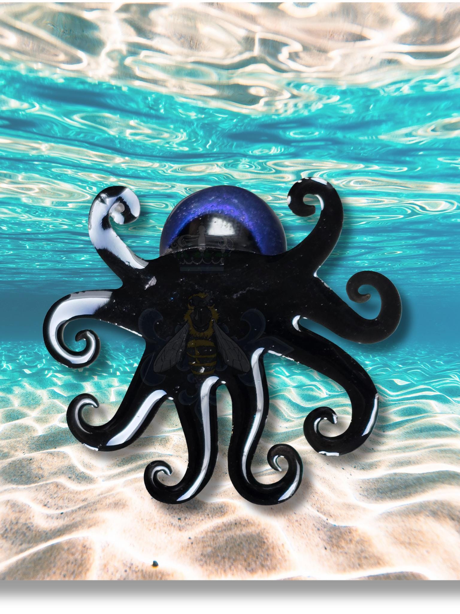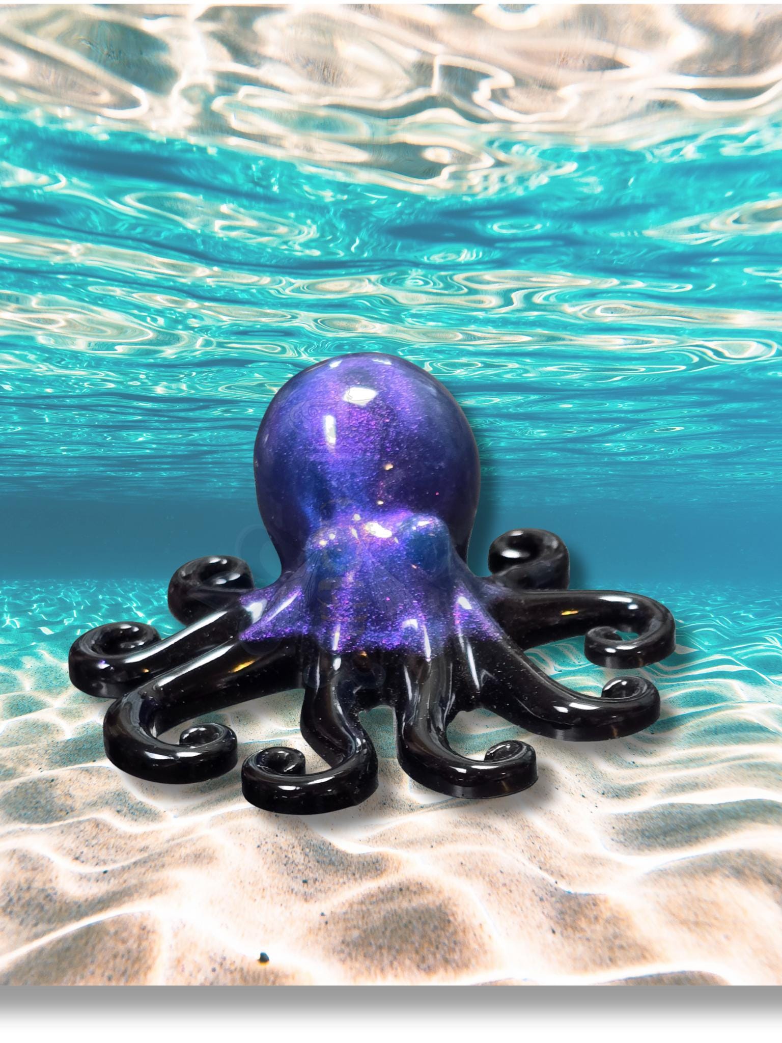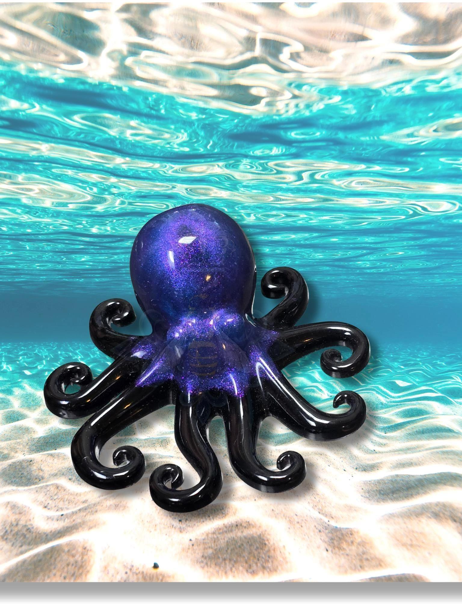 3.5 x 4 x 1 inch Octpous Figurine handmade from resin. Purple mica and black pigment paste were used to color the resin. Handwash only with a soft cloth and a mild soap.
