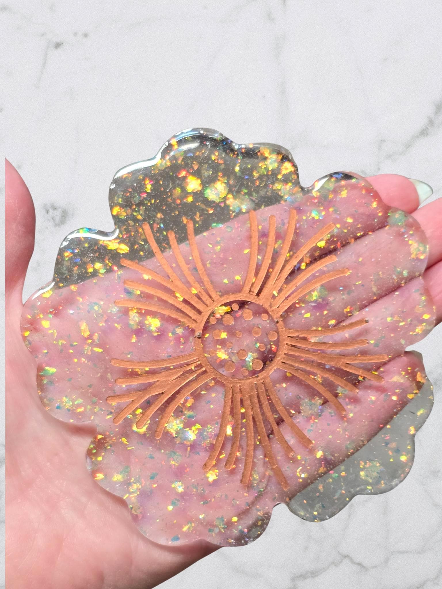 4.5 inch Flower Coaster. This Coaster is clear with Chamelon Flakes and copper detail. Handwash only with a soft cloth. Bumpers added on the bottom to prevent scratches.