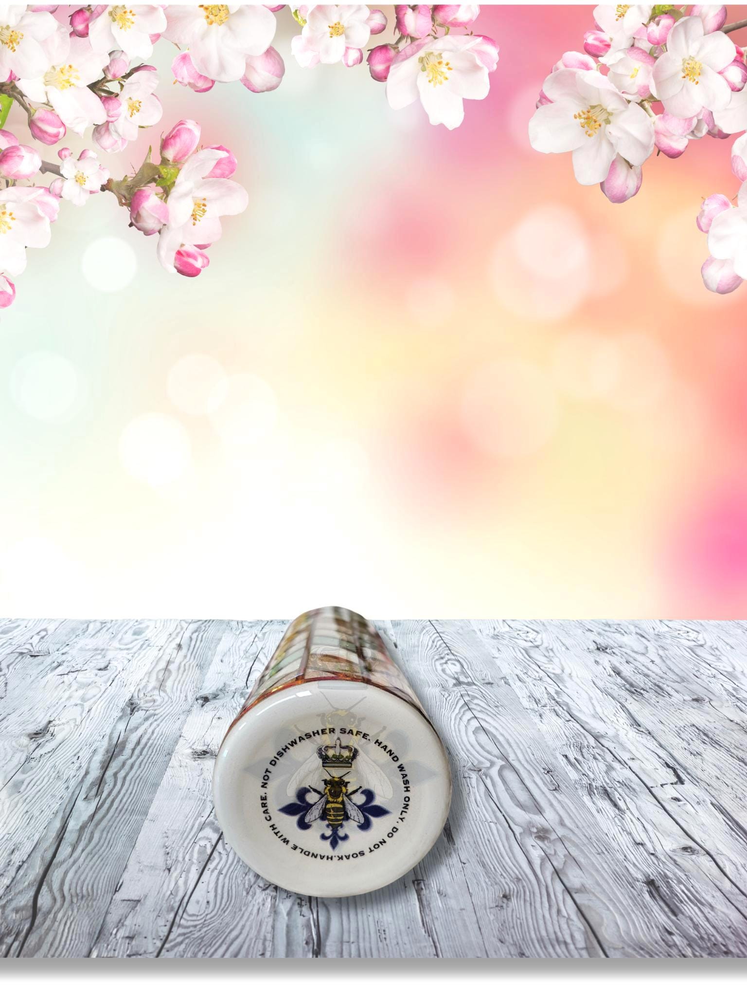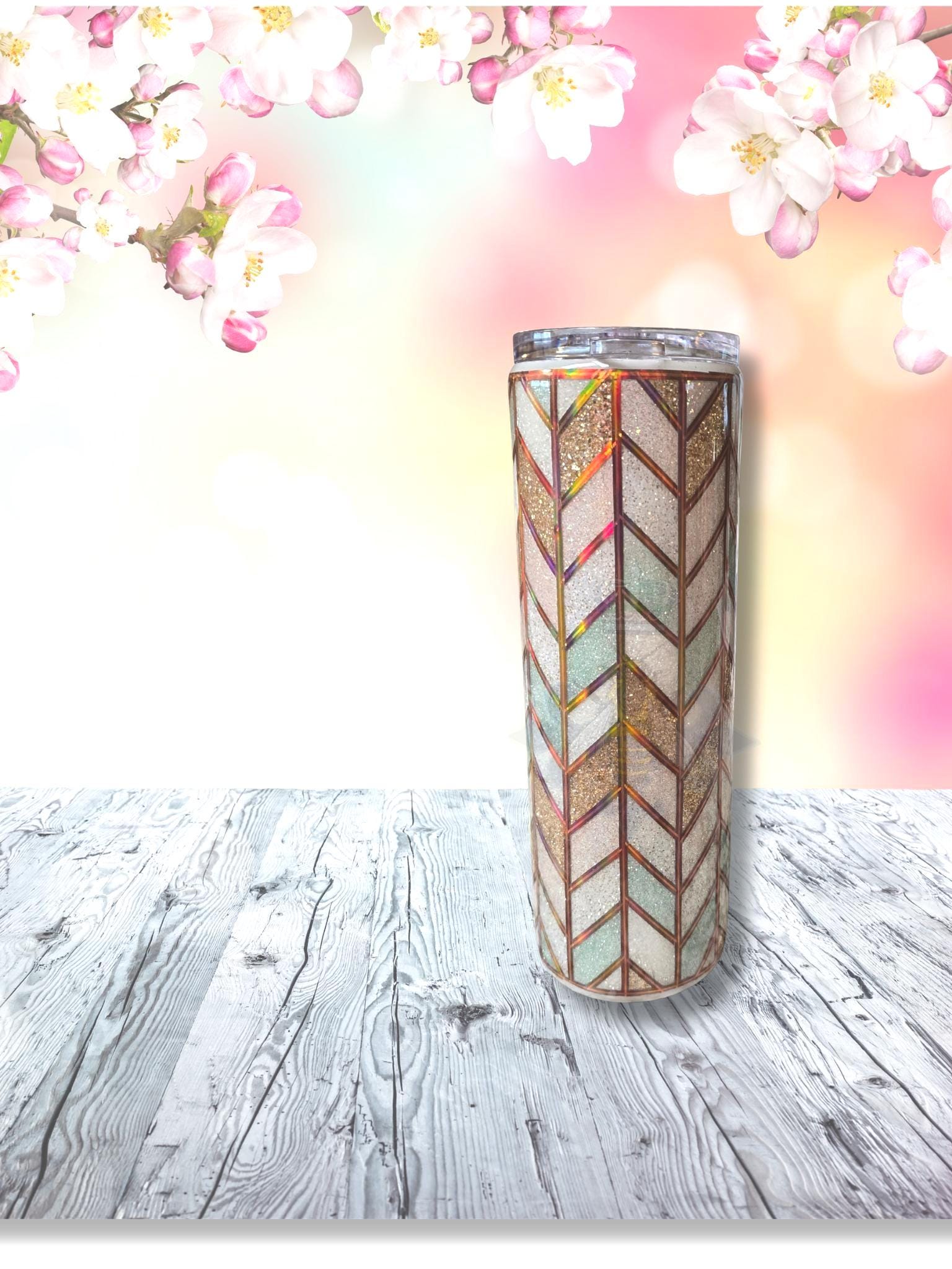 30 Oz StainlessSteel Tumbler. Spring Glitter Colors in Light Brown, pink, white, green. Hand striping makes this one of a kind Tumbler. Handwash Only no Microwave or Dishwasher. Clean with a soft cloth and mild soap.