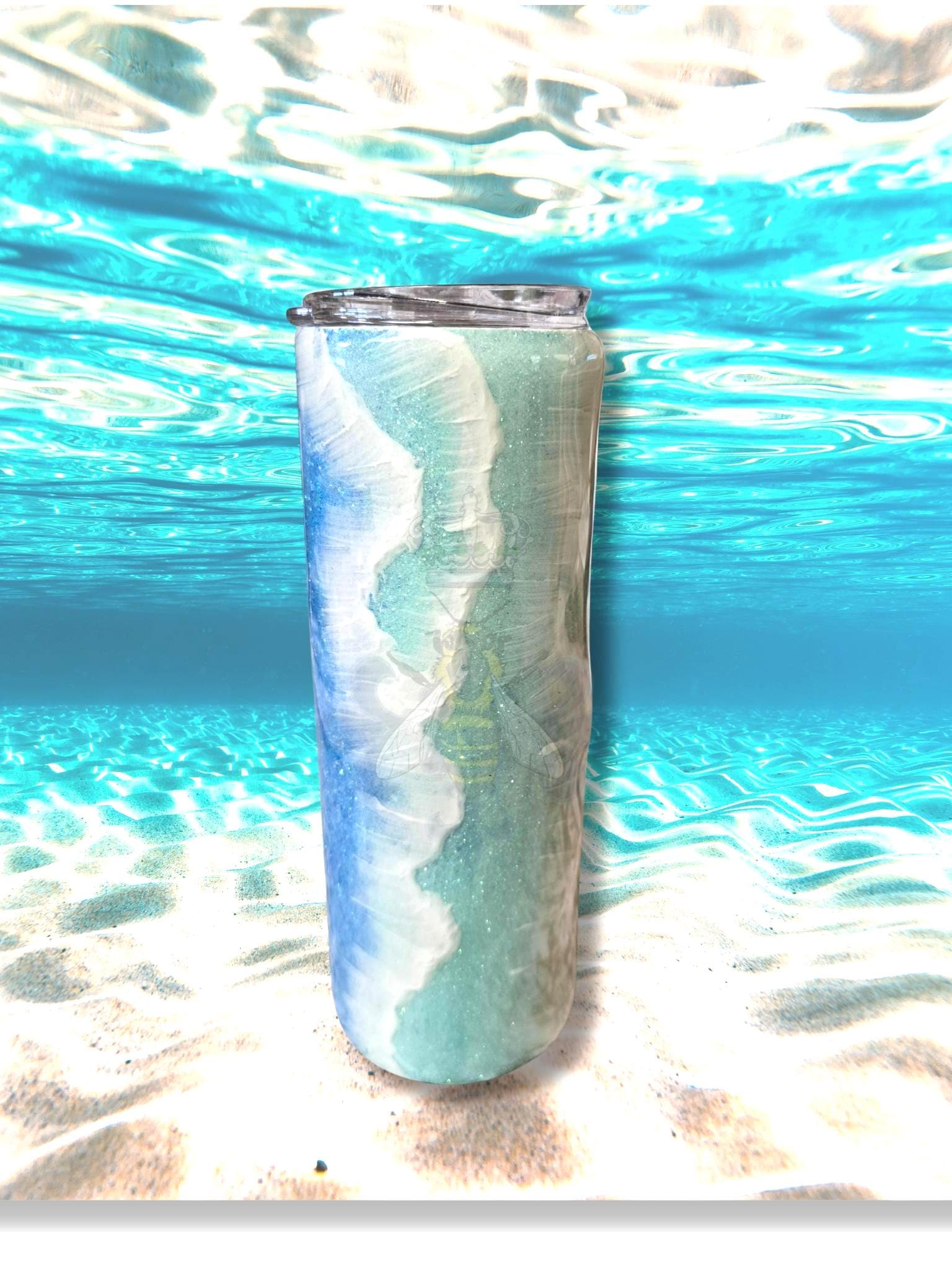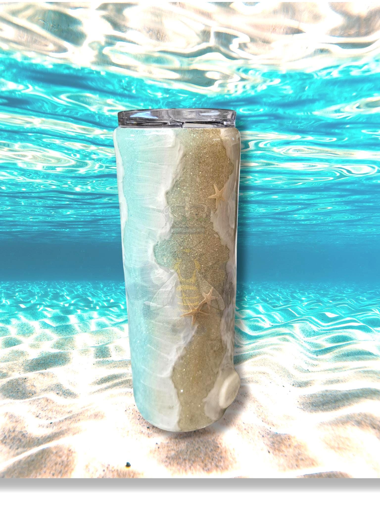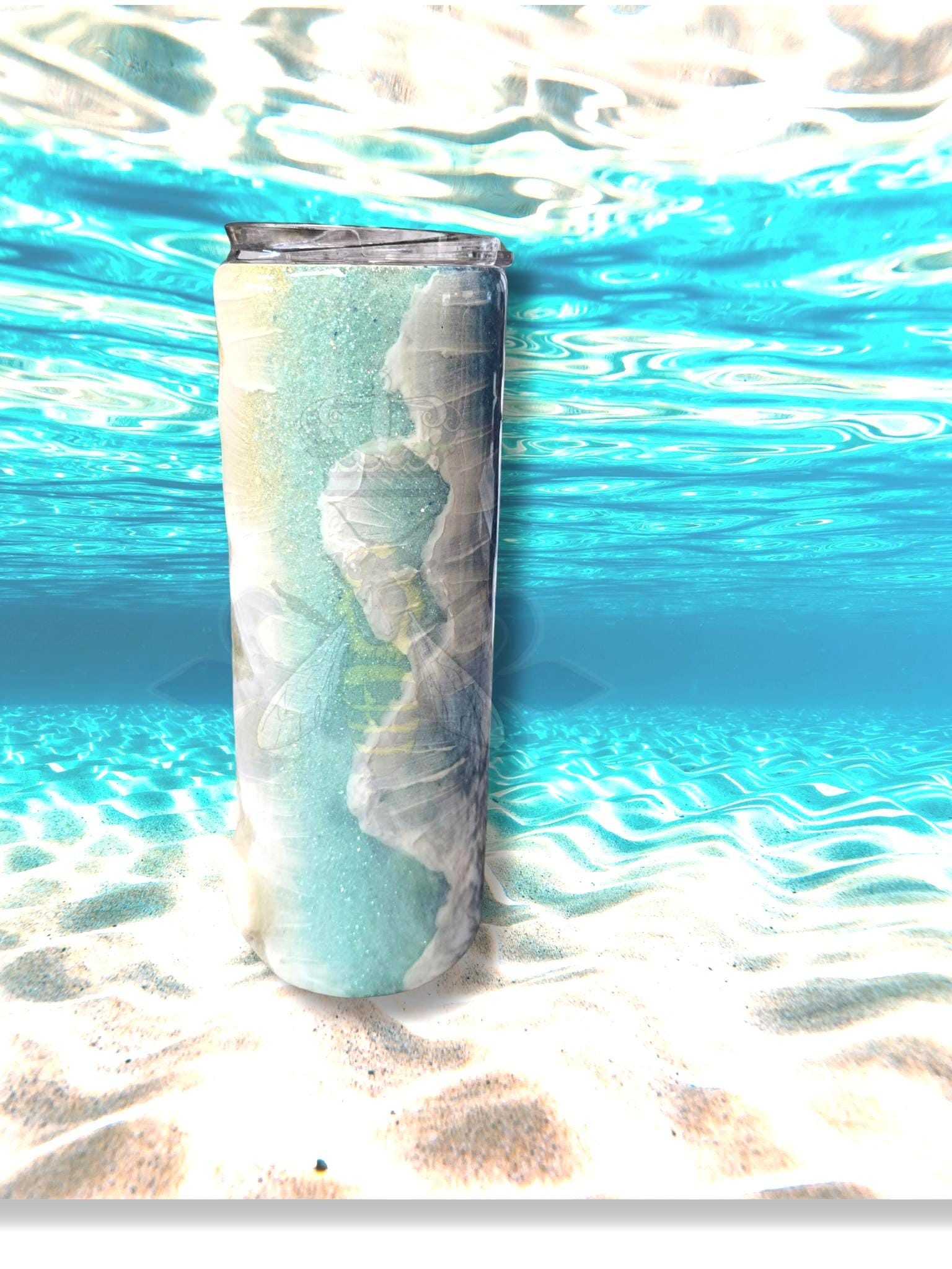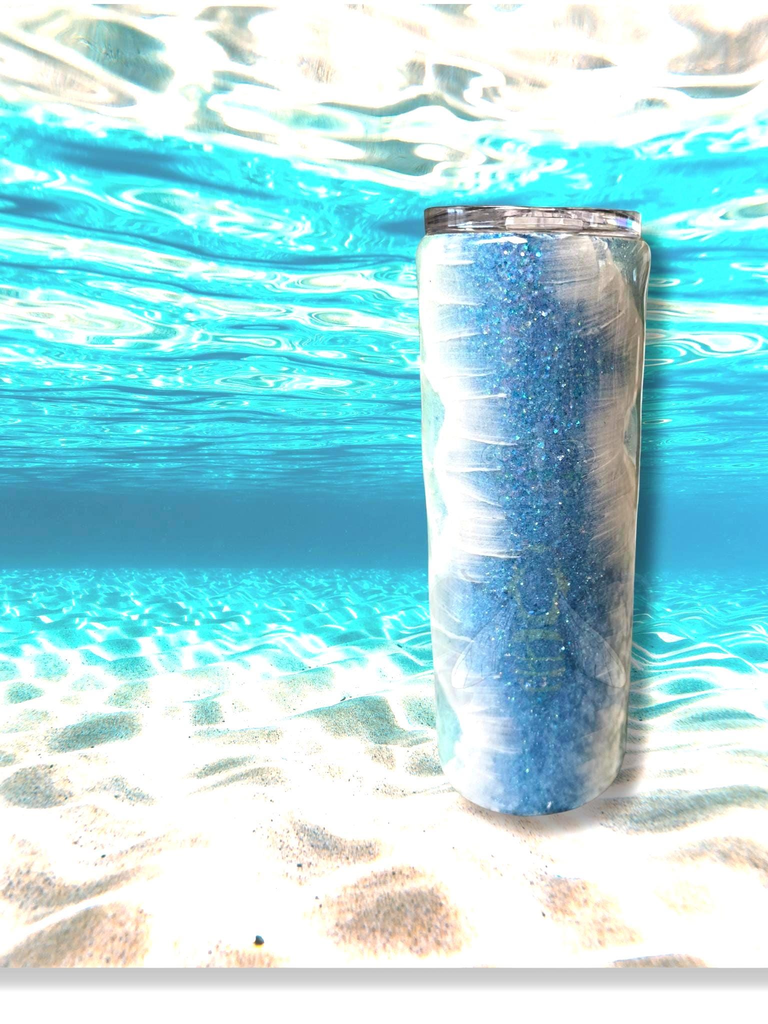 This 20 oz handpainted Tumbler. This Tumbler is a one of a kind. Beautiful Glitter with textured waves gives this Tumbler a realistic look. I added Starfish and a Sand Dollar for just the right accent. No Microwave and handwash with a soft cloth and mild detergent. Free shipping.