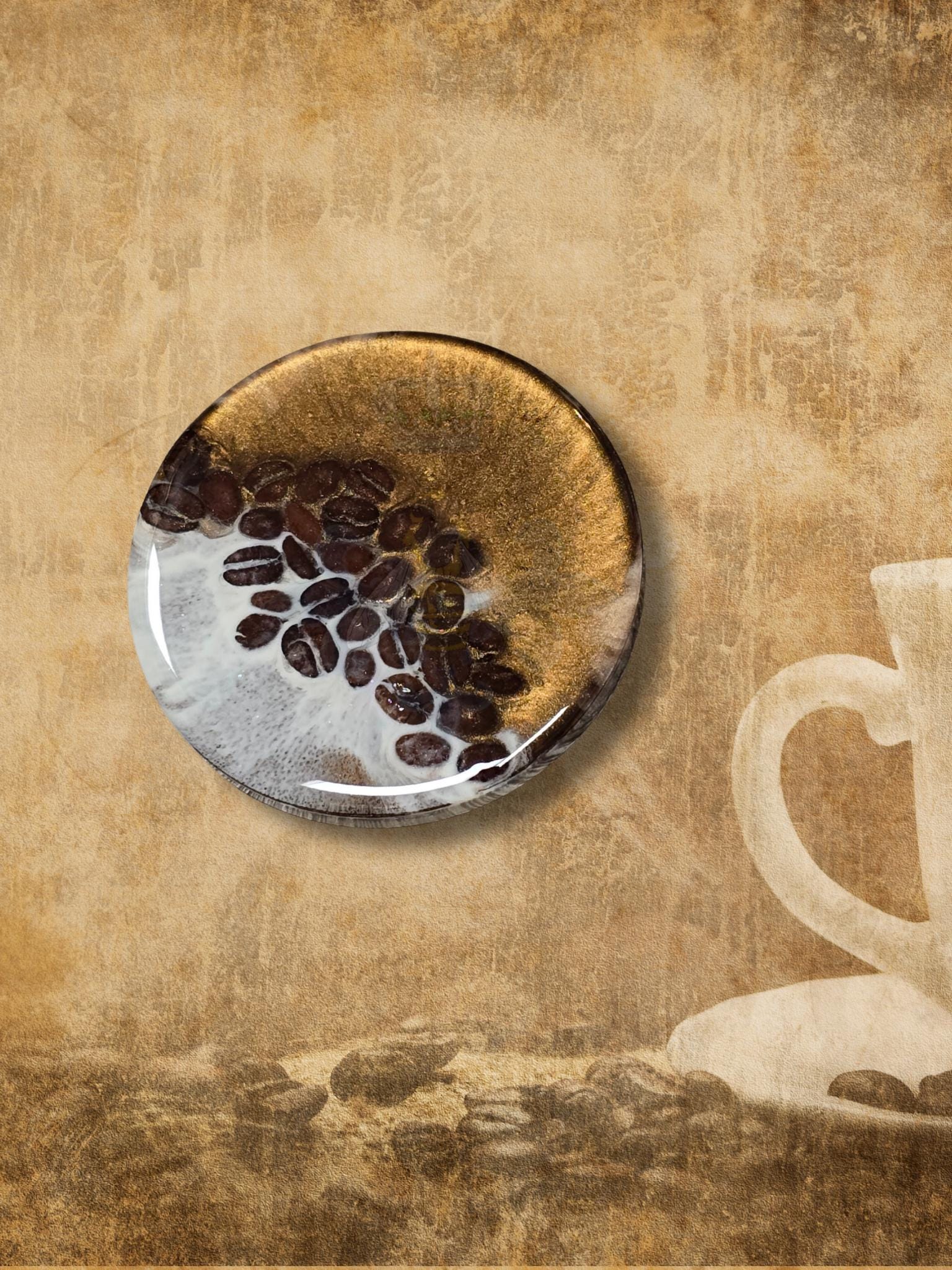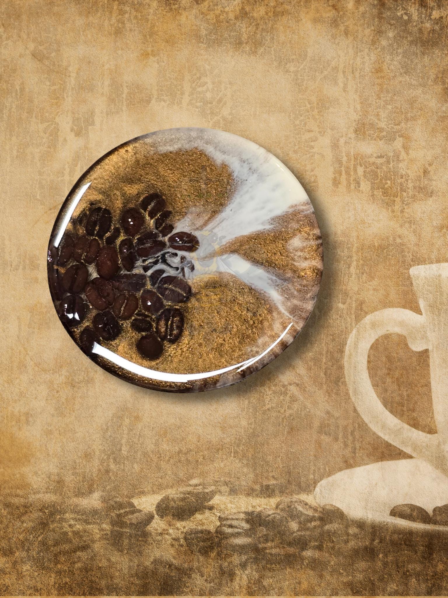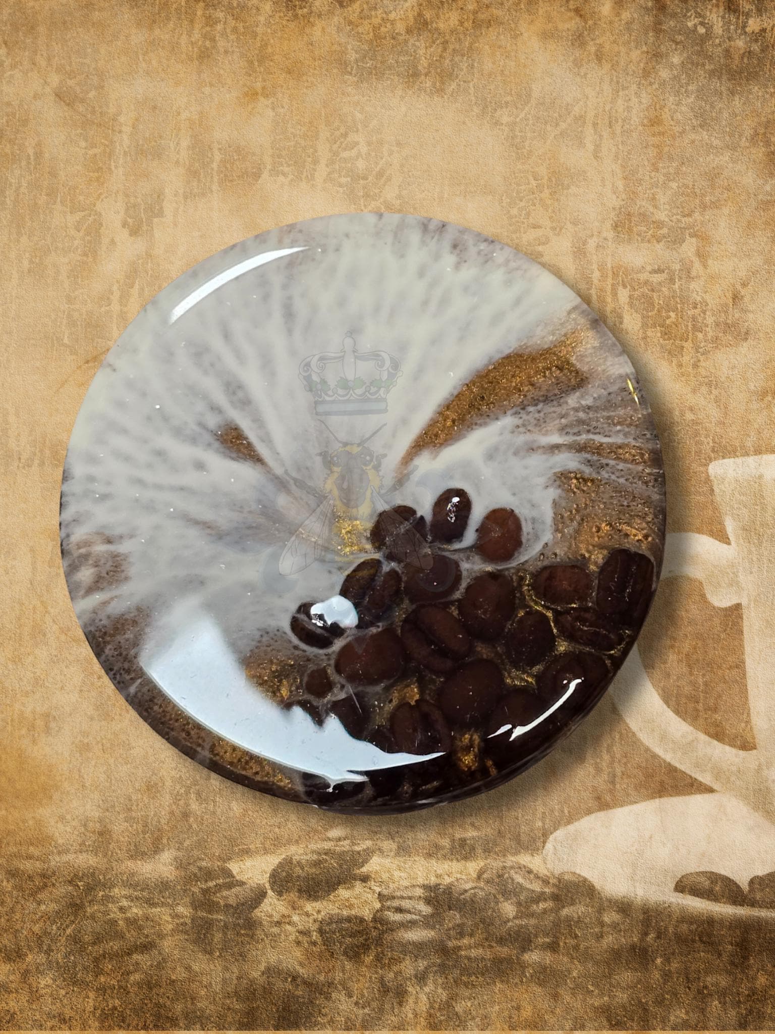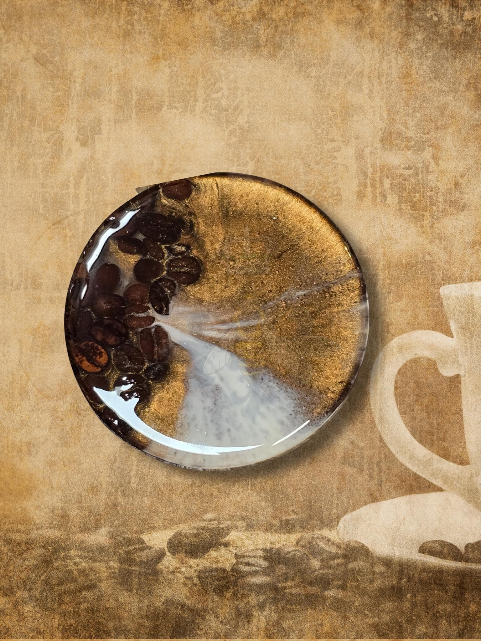 4 3.5 Coasters with a Coffee Theme. Real Coffee Beans were used. Beige Acrylic paint was used to color the cream resin and brown mica powder. There are bumpers on the bottom to prevent scratches No microwave, handwash with a soft cloth. Free Shipping.
