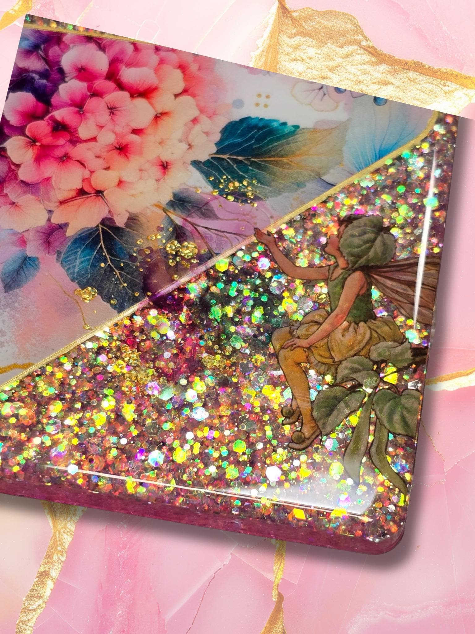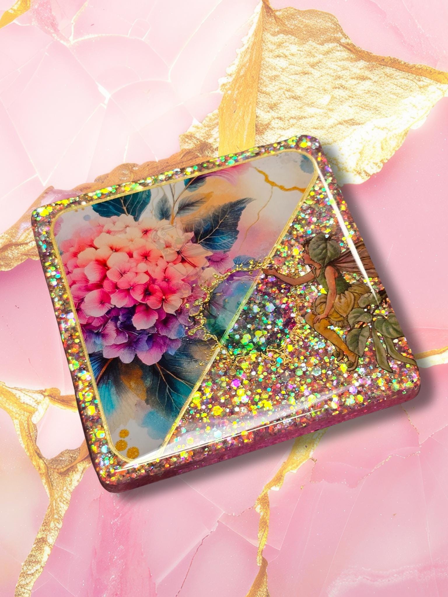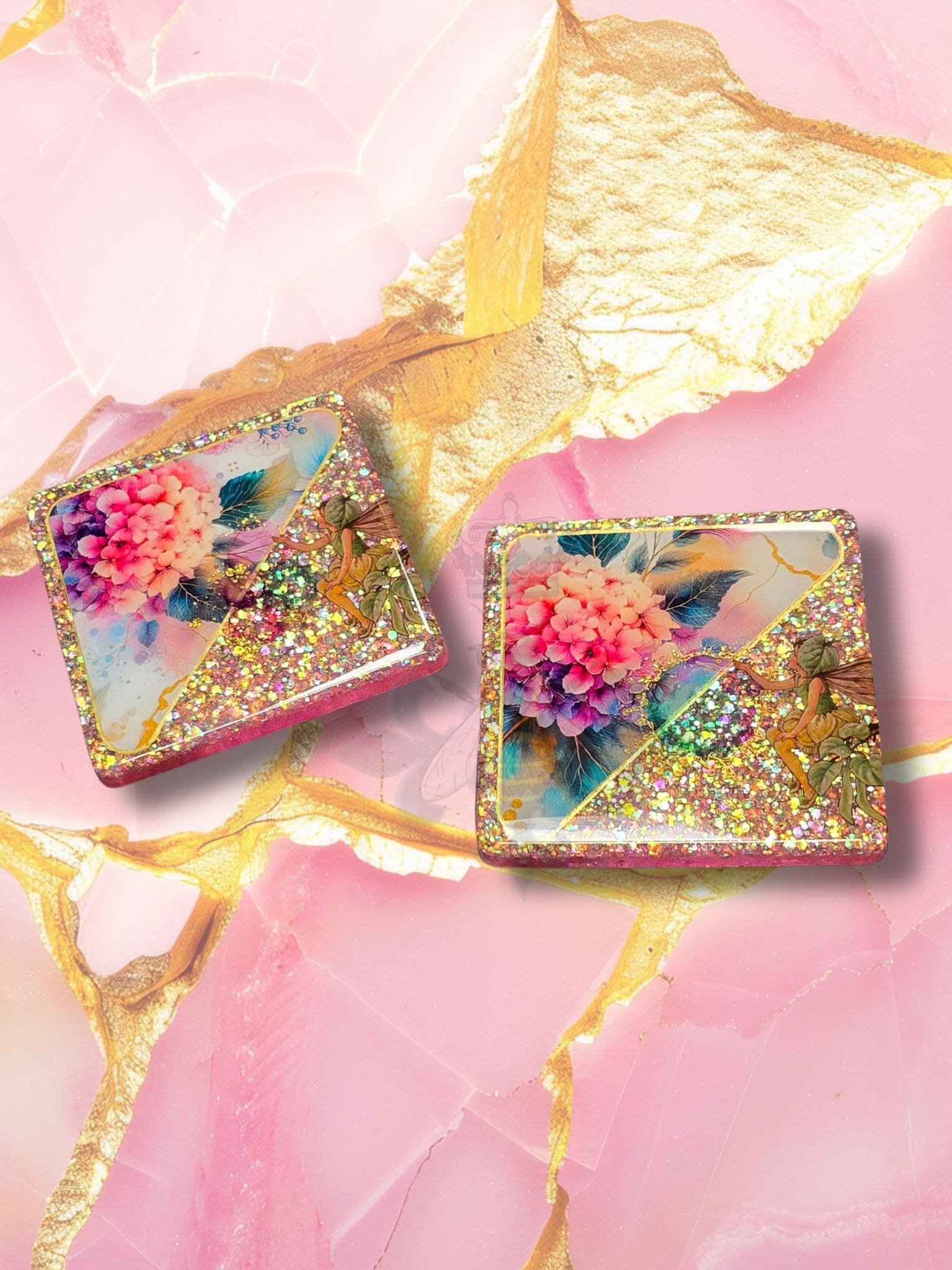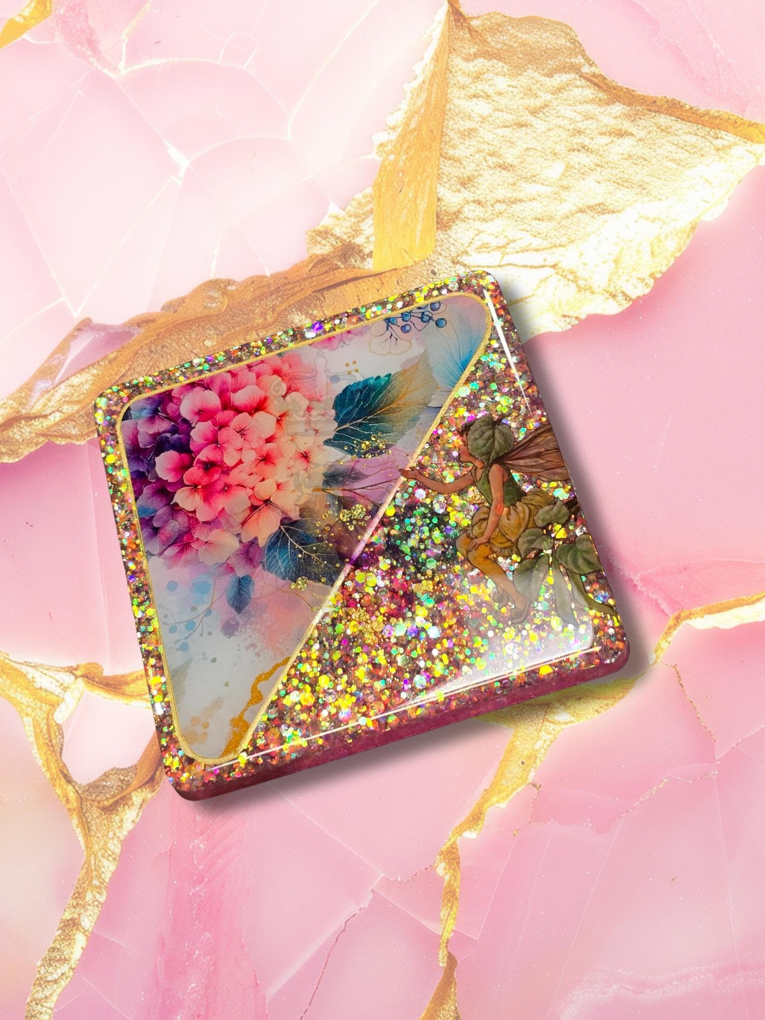 Two 4 inch Coasters. Pink Glitter, Floral Vinyl and Mixed Media Decals. Felt Bu.pers on Back to protect your furniture. Clean with a soft cloth and mild soap. No solvents, dishwasher or excessive heat. No microwave.