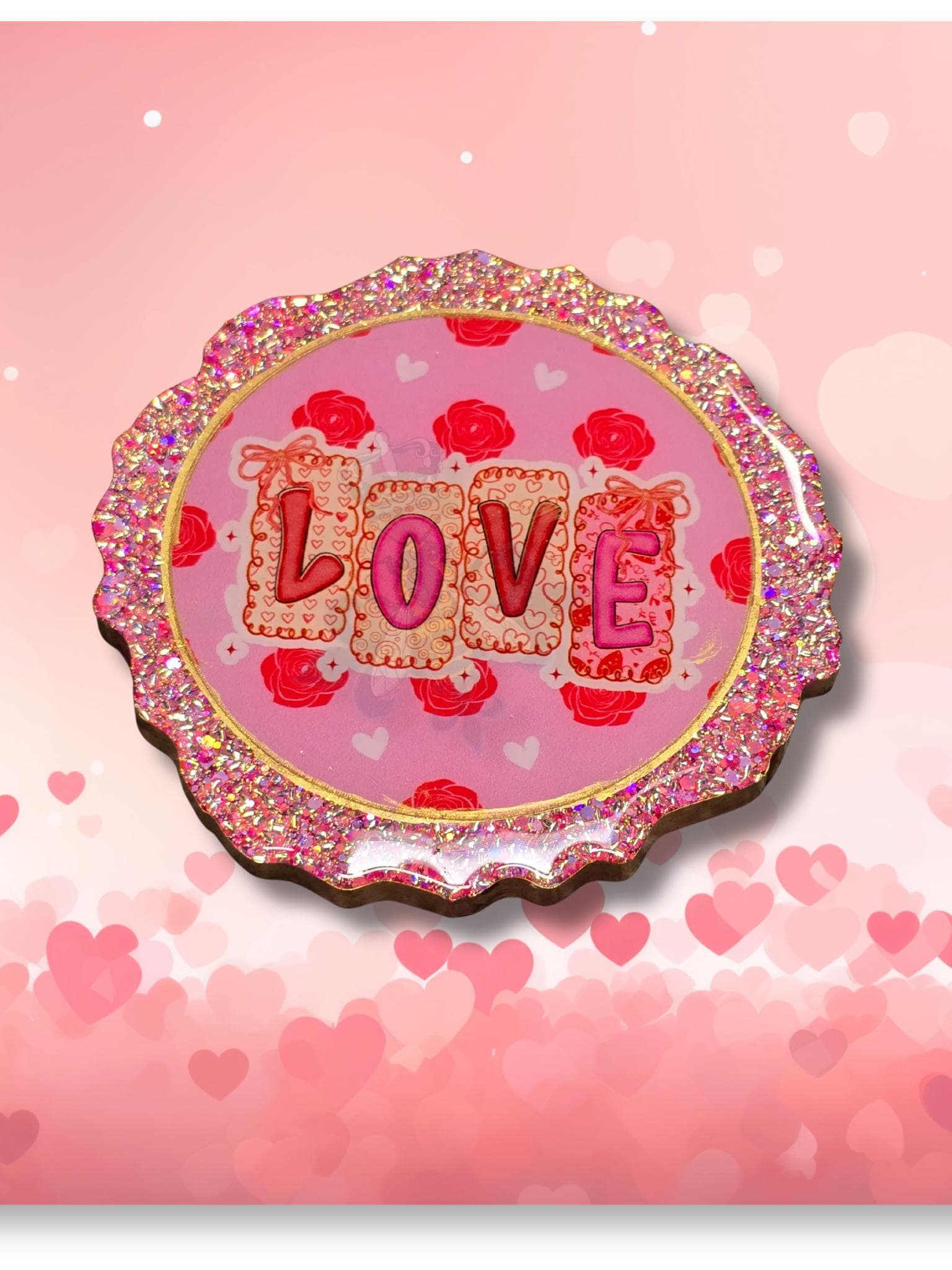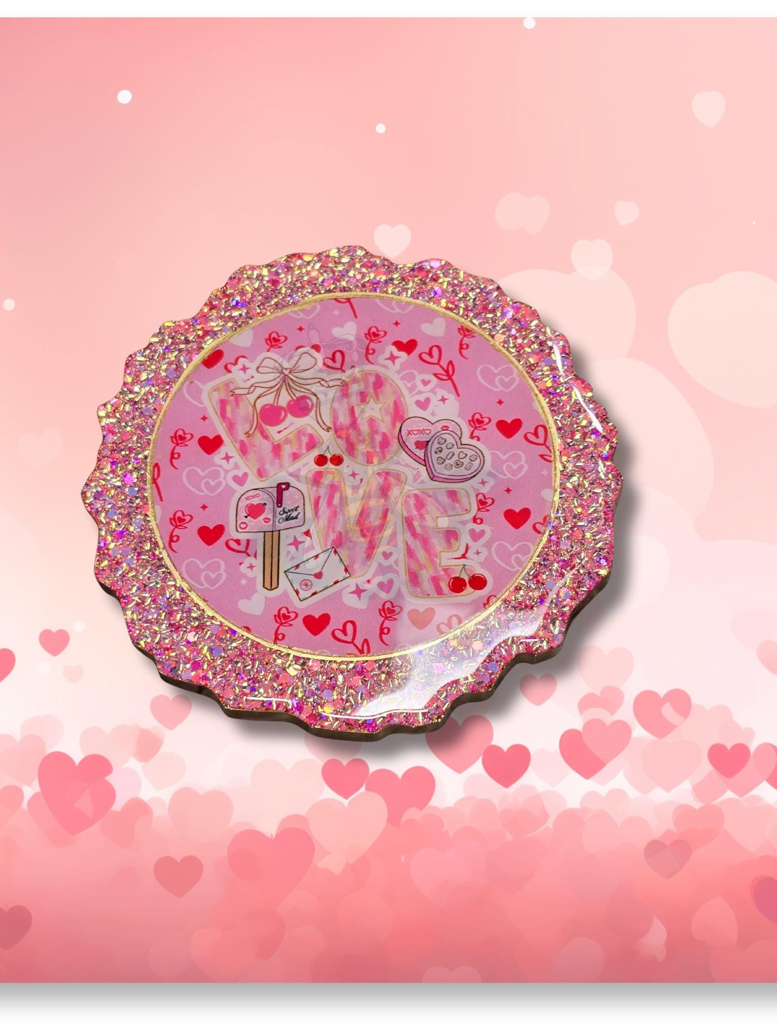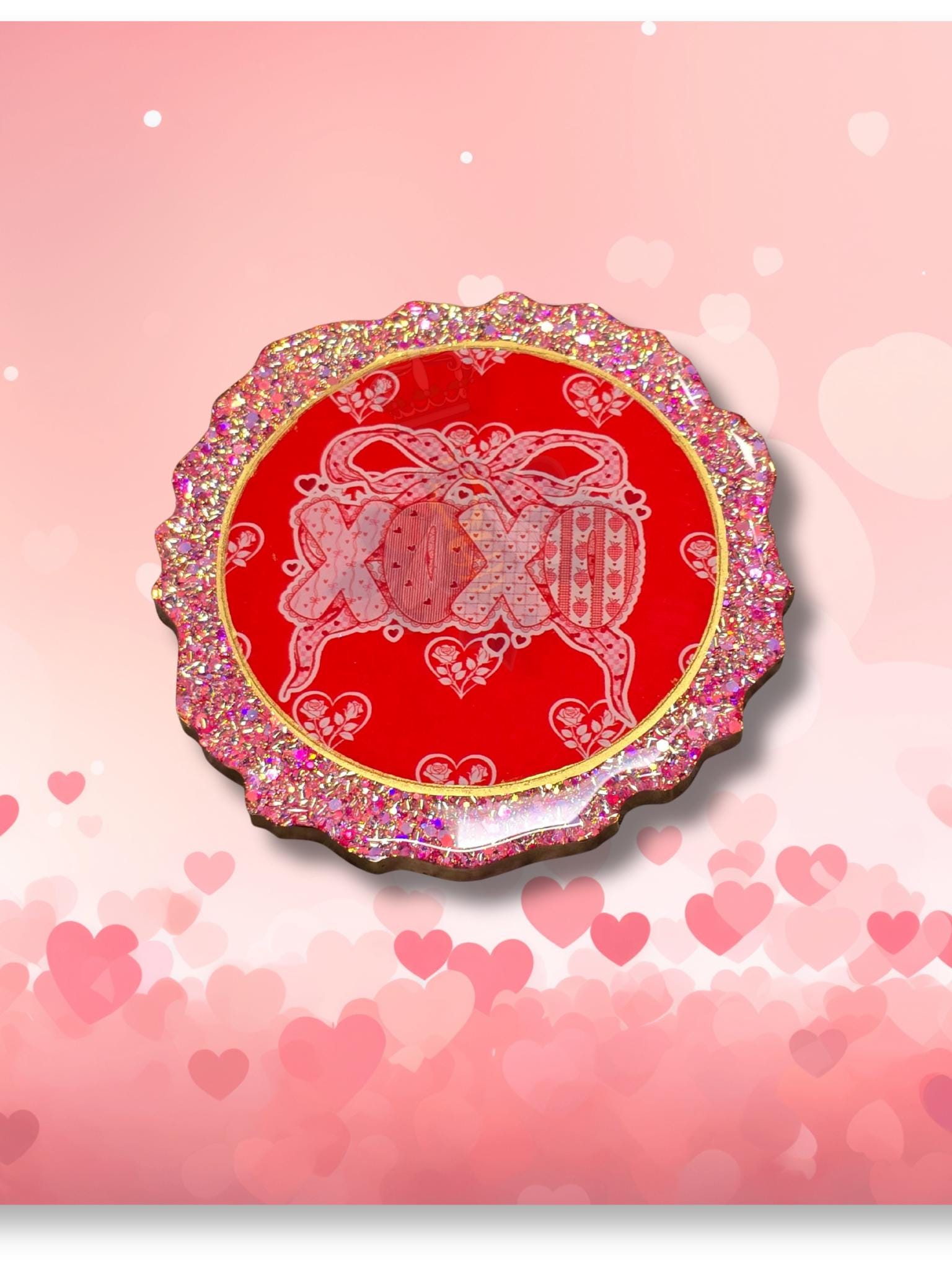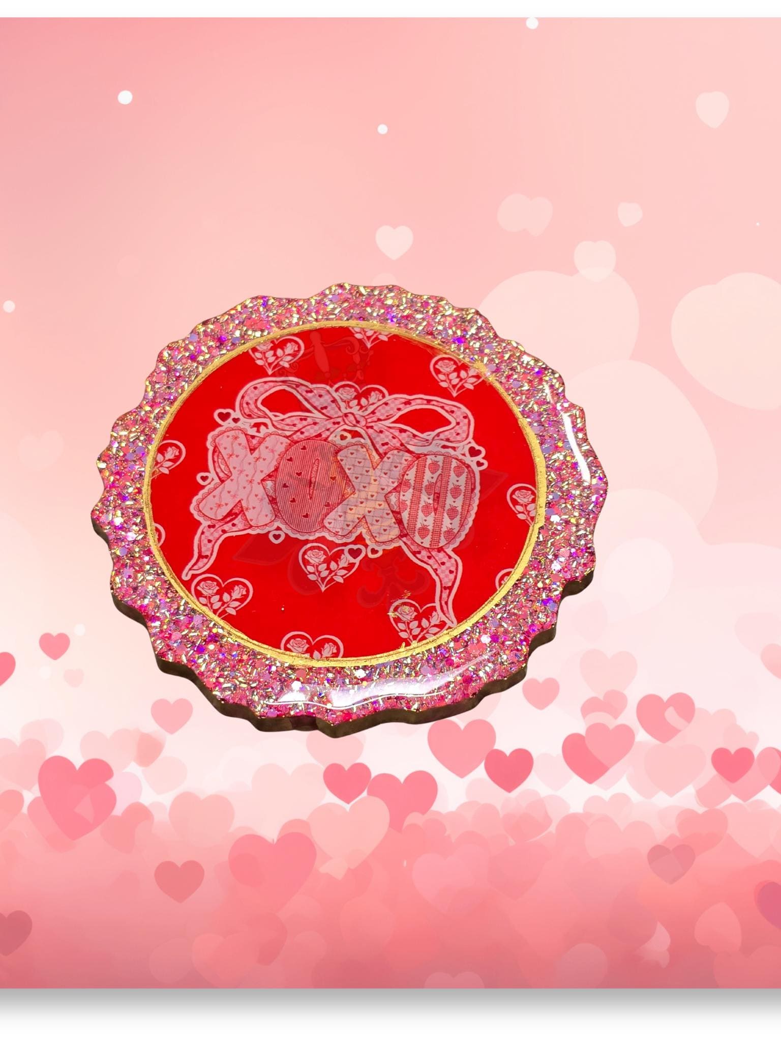 Set of 4 Pink Glitter resin coasters with Valentine UVDTF. These Coasters measure 5x.50 inches with gold on the edge. Bumpers are added to protect the furniture. Clean with a soft cloth and mild detergent. Do Not Clean with Solvents. No microwave or dishwasher. No excessive heat.