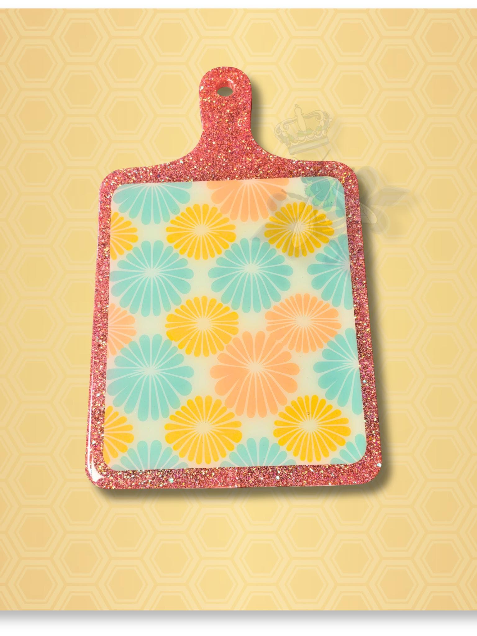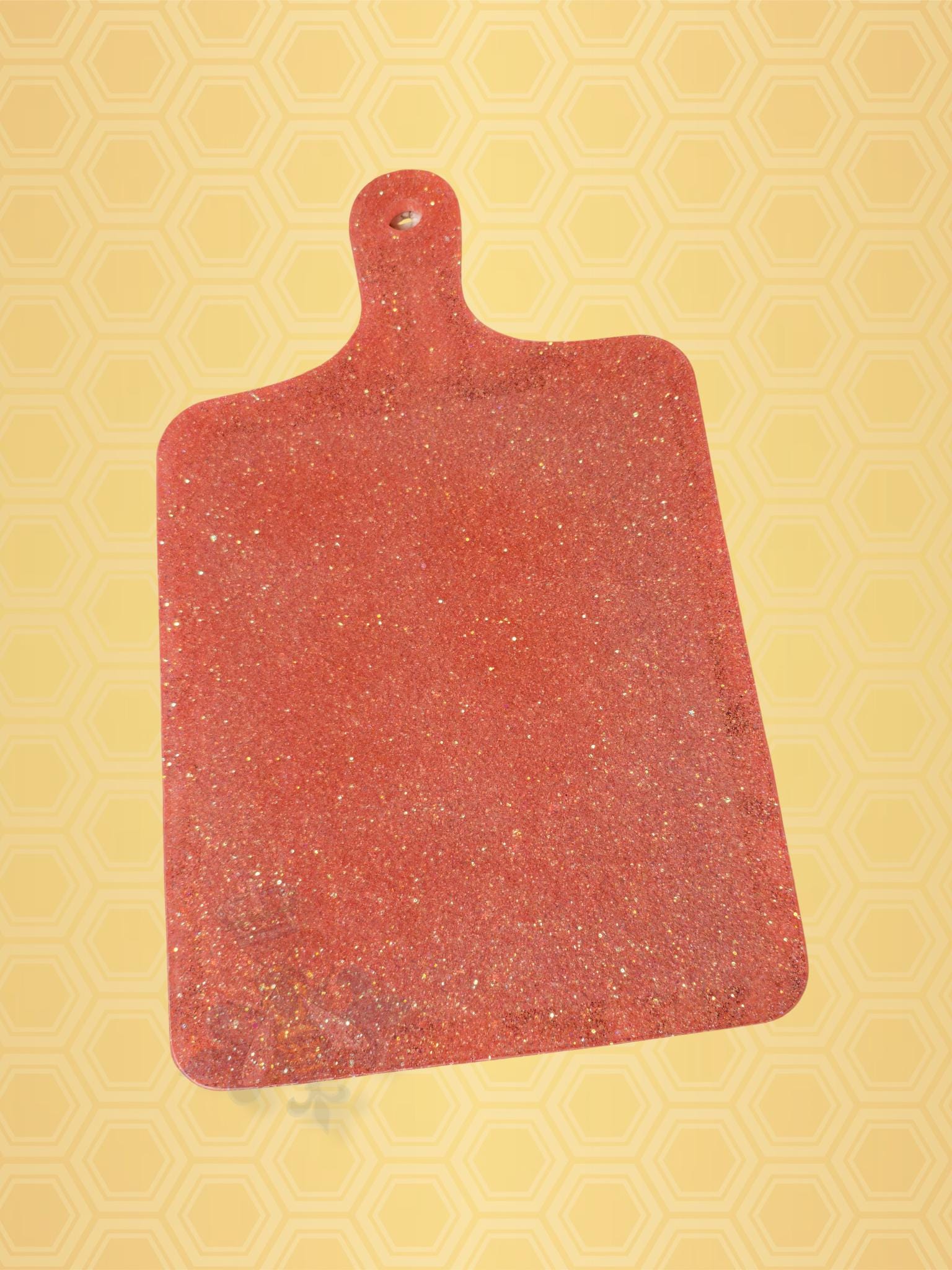 13 × 7.75 inch Charcuterie Board and 2 coasters 4". This Board is made with a custom Glitter mix with a deco vinyl Accent. Then a nice resinctopcoat for durability. Only for serving. Do not cut on this Board. Not Dishwasher or Microwave compatible. Please keep out of extreme heat.